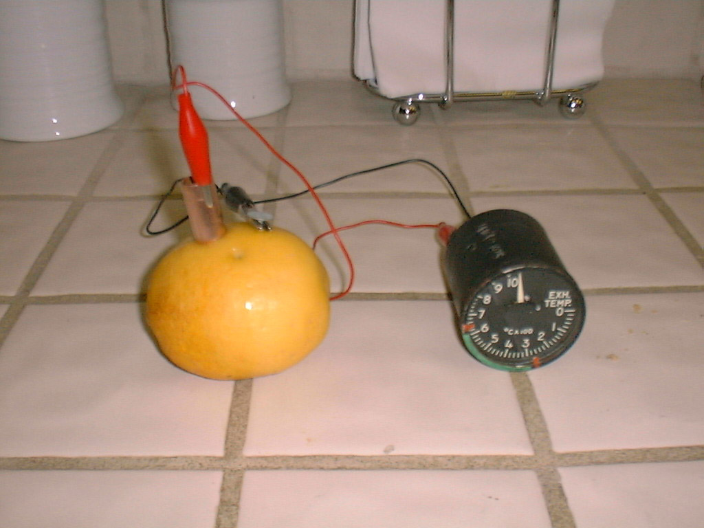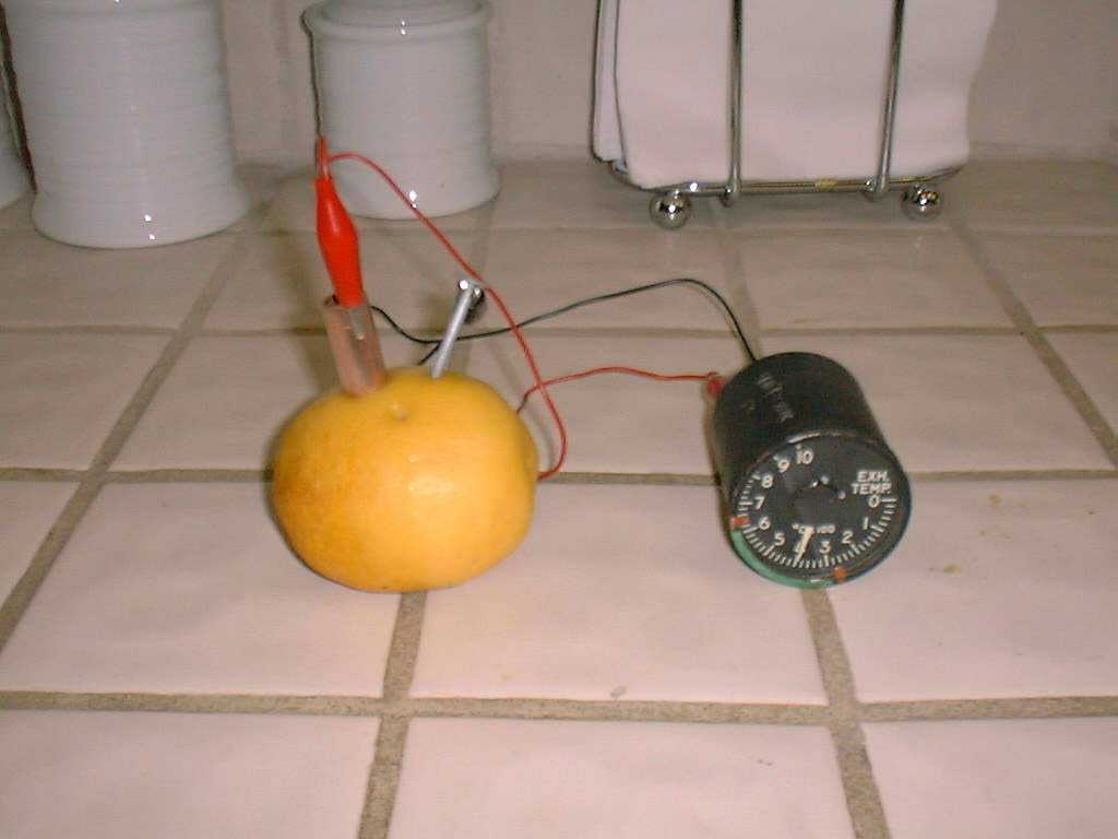 Jam the copper down into the lemon. Jam the nail into the lemon, making sure it doesn't touch the copper. Connect the alligator clips to the "leads" and the terminals on the gauge. Done deal.