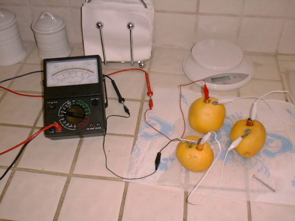 I actually set up three lemons in this fashion, with jumpers joining the cathode of each lemon to the anode of another. When run in series, I got the following measurements (yeah, I know, a digital multimeter would provide much more accuracy):